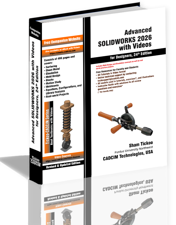 The Advanced SOLIDWORKS 2026 with Videos for Designers textbook has been written to help the users who are interested in learning 3D designs. This book explains in detail the procedure of creating complex surface and sheet metal designs, saving sketches as blocks, creating mechanisms using blocks, working with equations, configurations, and library features. Apart from these topics the textbook also describes motion study and mold design concepts. Additionally, some real-world projects are included in the book that will help readers to related the concepts learned through the book with the industry designs. Also, a number of real-world mechanical engineering industry examples, tutorials, and exercises have been used for the users to understand the software easily and effectively.